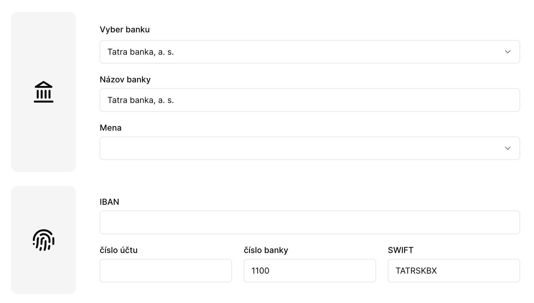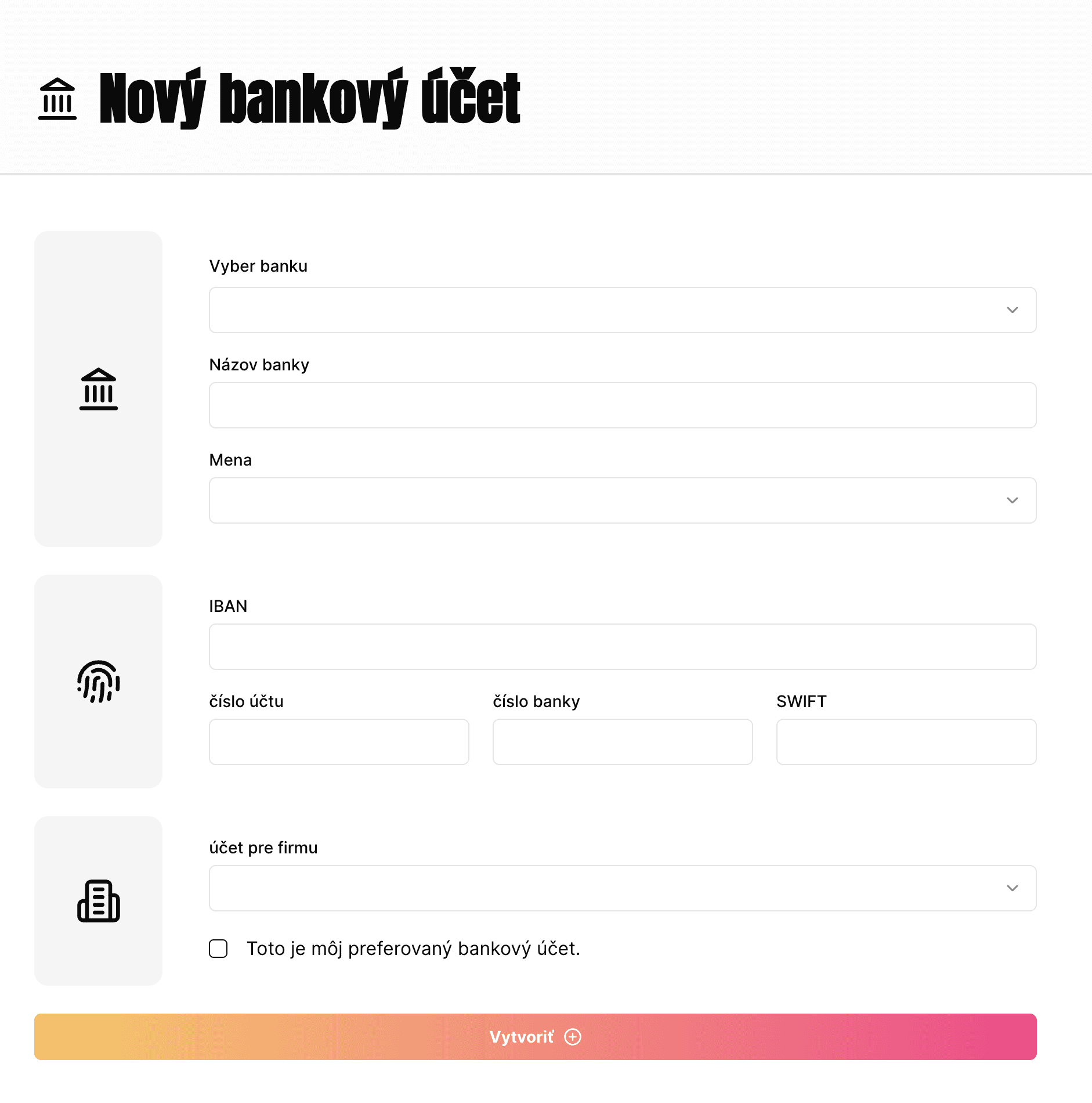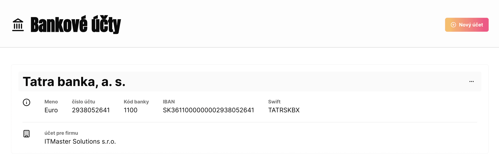 Pridávajte viacero bankových účtov, vyberte si účet pri fakturácii, nastavte predvolený účet a predvyplňte údaje pre vybranú banku.